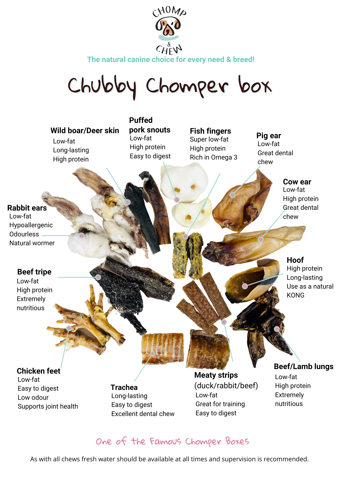 Never leave your dog unsupervised with treats and chews to avoid potential choking hazards. Please ensure that your dog has access to fresh water at all times.