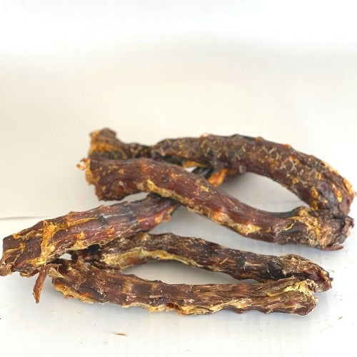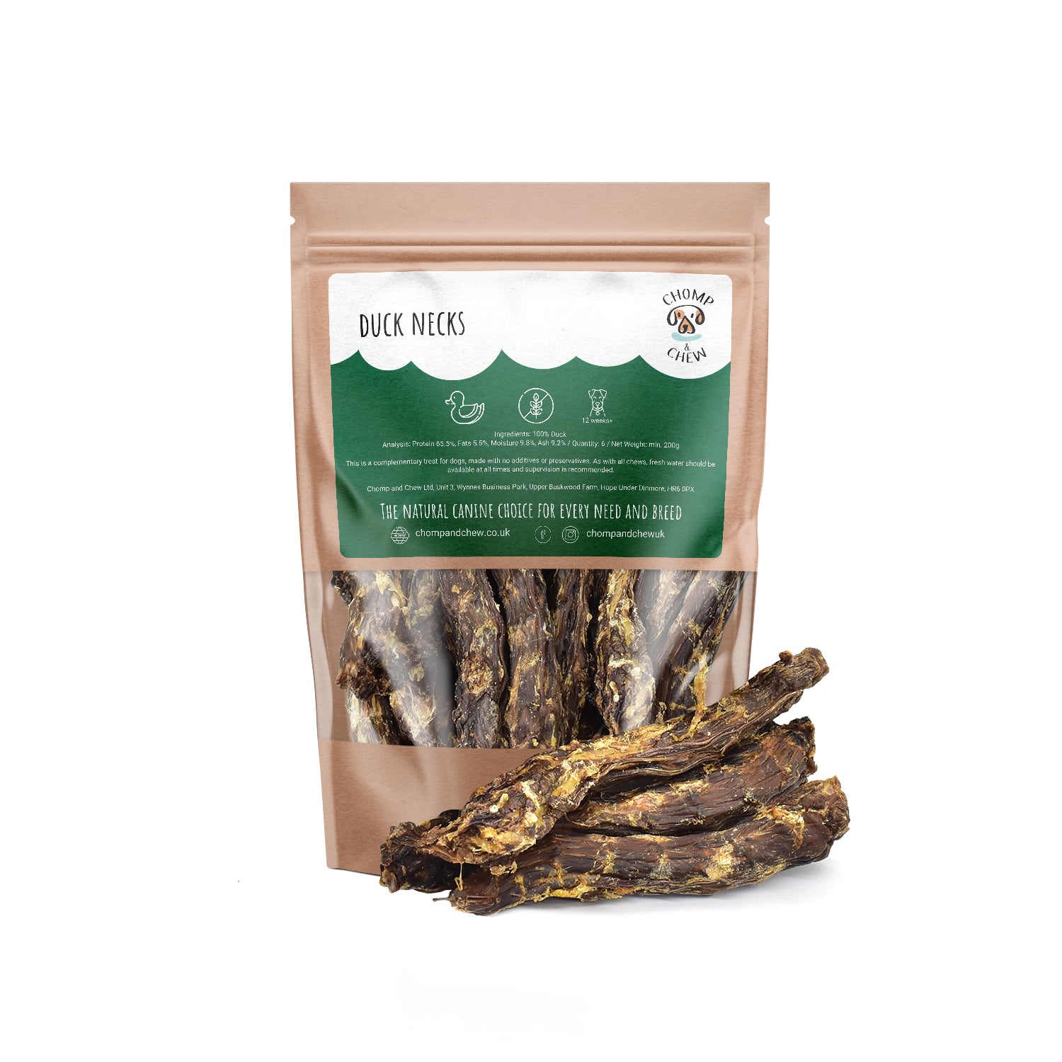 Duck Necks make excellent dog chews, containing both meat and bone. The necks are air-dried at a low temperature ensuring that the tiny bones don't splinter but crumble instead. They are similar to chicken necks but bigger and meatier, providing longer-lasting chews.