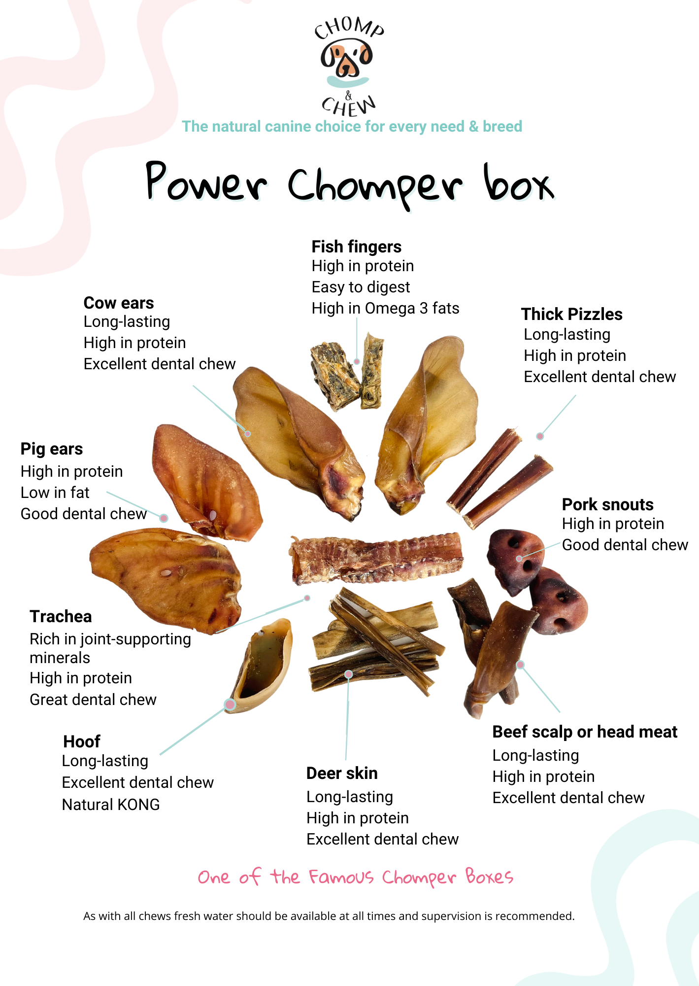 The Power Chomper Box® is a great value variety pack full of long-lasting dog treats and chews for serious chompers! It's full of natural, delicious chews, which help remove tartar from their teeth and strengthen their jaws. Chewing can also help to reduce boredom, anxiety and frustration.