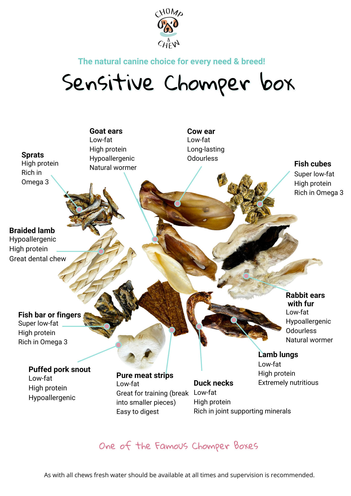 The Sensitive Chomper Box® is a great value box specially created for dogs with sensitivities and/or intolerances. All the treats in this box are hypoallergenic and easy on dogs' tummies. Some dog breeds are sensitive to purine-rich treats but even those breeds can enjoy the goodies in this box! It includes a good mix of long-lasting chews as well as some everyday treats.