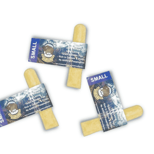 Yak Chews find their origin in the hills of the Himalayas. Originally made for human consumption, they are still widely eaten by the Himalayan people and their dogs. Yak chews are made from a mix of skimmed Yak and Cow milk. A very small amount of lime juice and salt is added to coagulate (harden) the milk, which is then compressed into blocks and smoke dried for 28 days to give the chews their unique flavour.