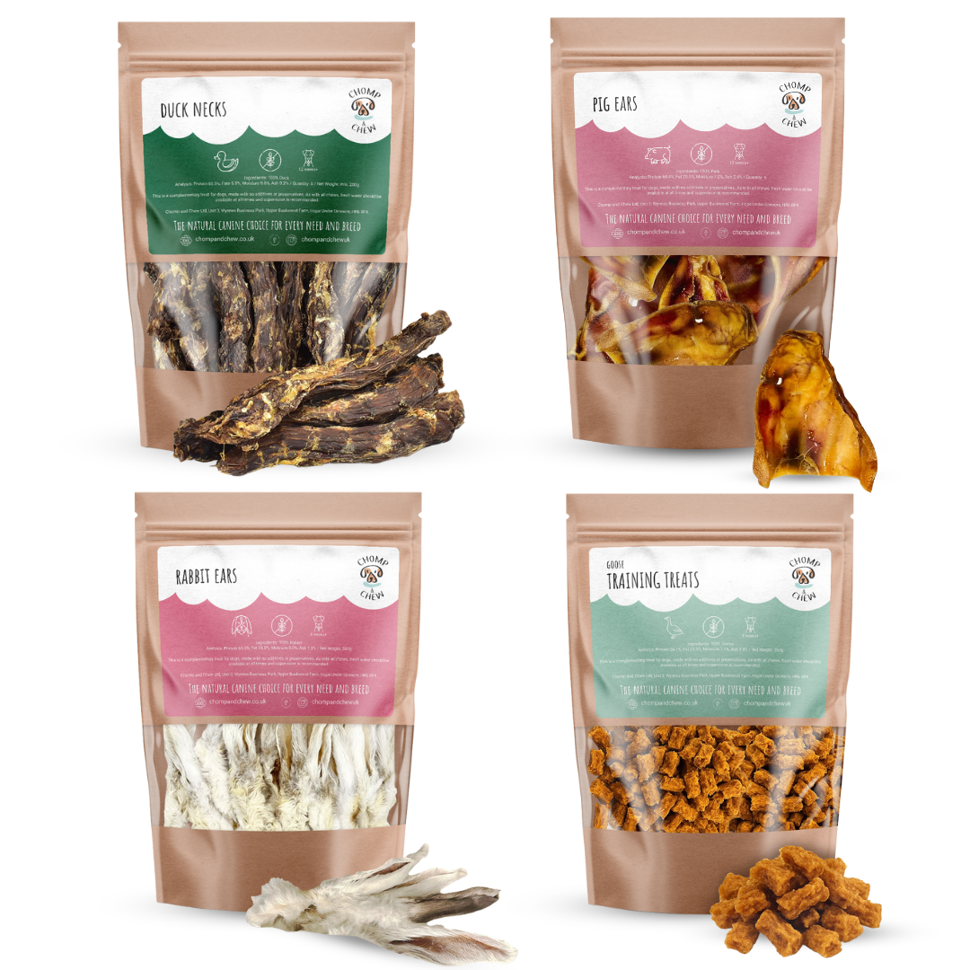 This bundle is suitable for dogs 12 weeks+ (Rabbit Ears & Training Treats can be fed from 8 weeks, Pig Ears & Duck Necks from 12 weeks)