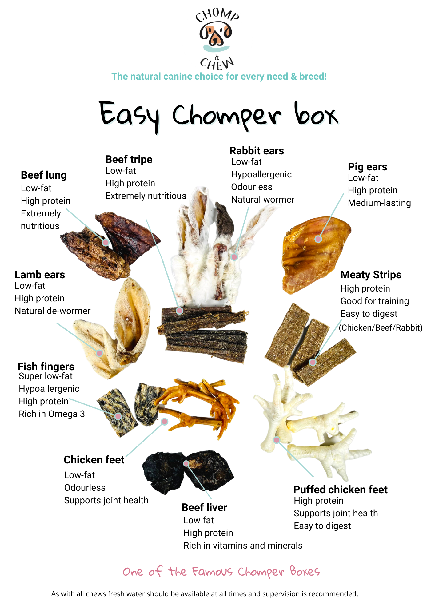 Never leave your dog unsupervised with treats and chews to avoid potential choking hazards. Please ensure that your dog has access to fresh water at all times.